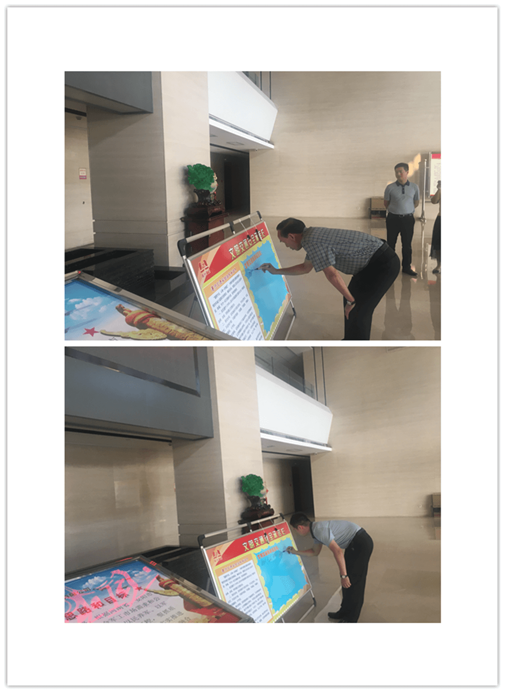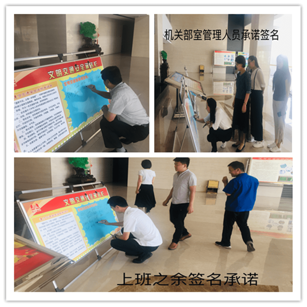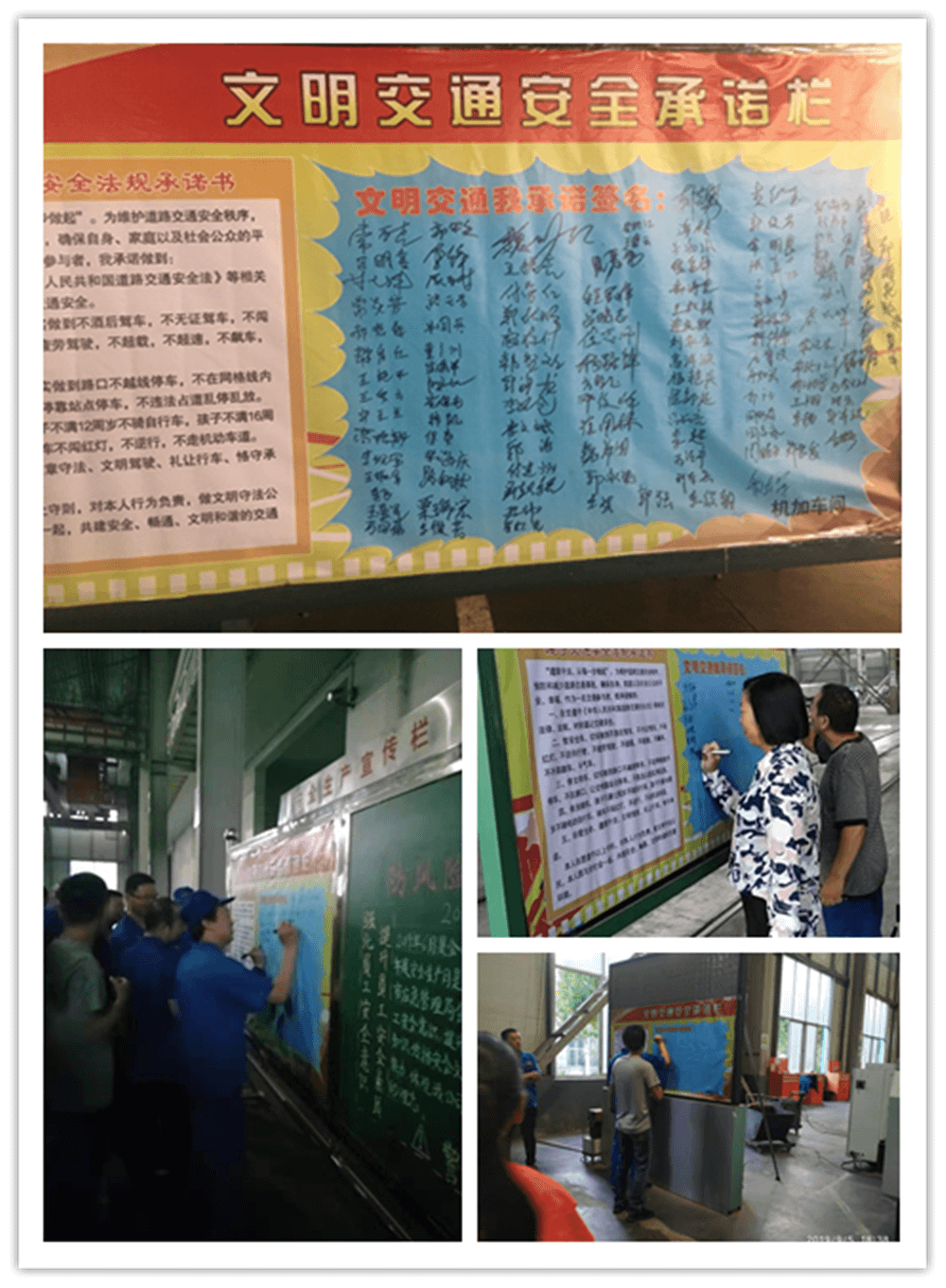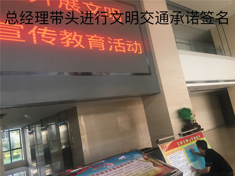 签订“遵守交通安全法规承诺书”。公司制作了“遵守交通安全法规承诺栏”版面十余块,摆放在醒目位置,以部门为单位,每位员工在版面上进行签名承诺。公司总经理郭钏带头在《文明交通承诺栏》上签名,其他领导和部门员工也陆续进行了签名,通过交通安全承诺签名,使每位员工时刻提醒自己,履行自己承诺。