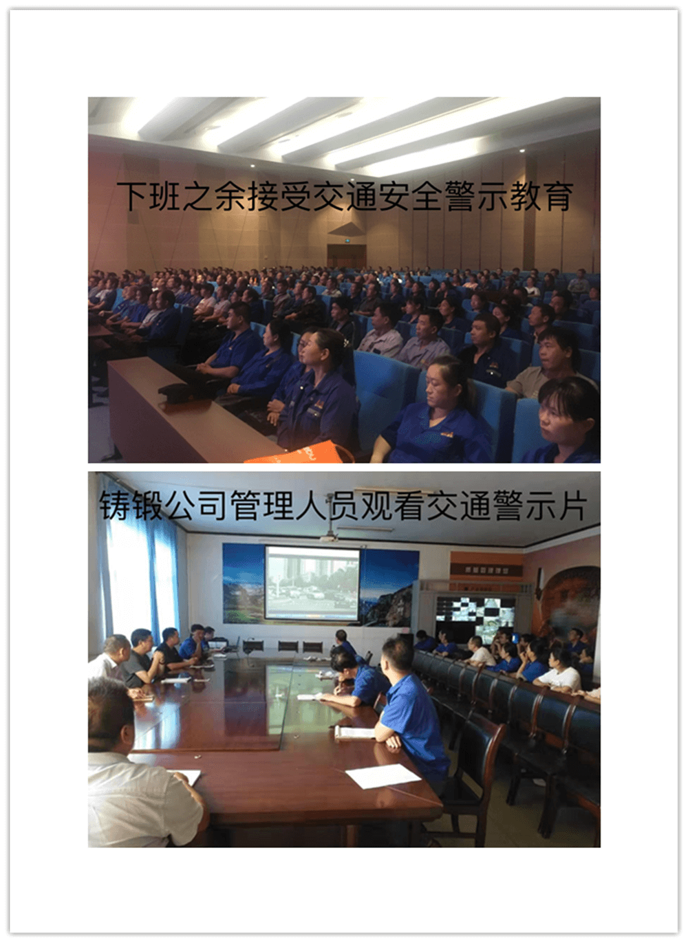 开展警示片宣传教育活动。集团公司按单位分三次组织1000余名员工观看交通事故警示教育片,集团公司子公司林钢、铸锻也积极按照方案要求组织收看教育片,同时各单位还利用本部门的微信工作群进行转发收看,达到警示教育全面覆盖之目的。
